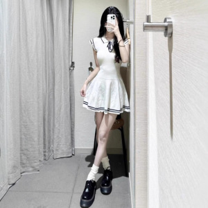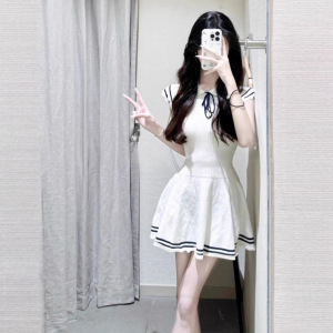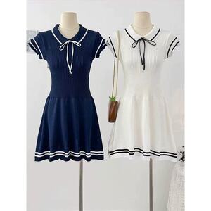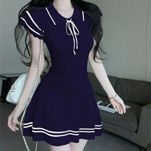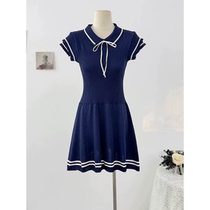 学院风针织条纹短袖连衣裙女2025夏季新款翻领系带收腰A字短裙