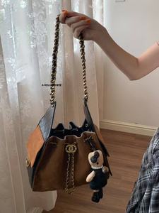 外贸新款小香风菱格链条头层牛皮抽绳水桶包冬季简约斜挎腋下女包