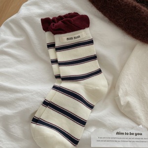 25秋冬新款泡泡口条纹女袜韩系堆堆袜学院风miu系布标中筒袜潮袜