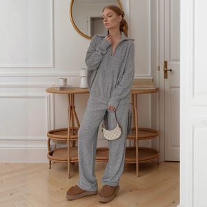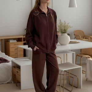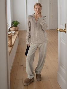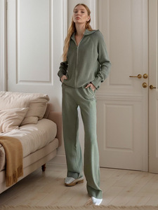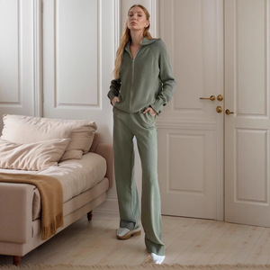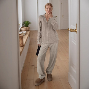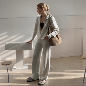 跨境拉链开衫毛衣套装欧美2025秋冬针织开衫+阔腿长裤毛衣套装女