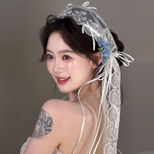 法式浪漫新娘蕾丝蝴蝶结长款发带韩式造型头饰森系写真旅拍头纱