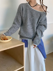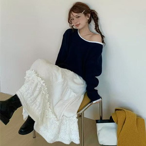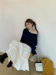 韩系撞色一字领毛衣女2025秋冬新款小众纯欲风设计感漏肩针织上衣