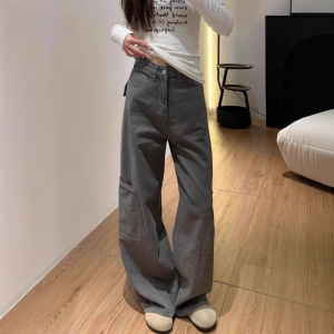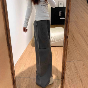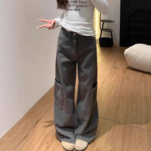 灰色阔腿工装裤女秋季新款大码宽松梨形身材显瘦直筒休闲裤