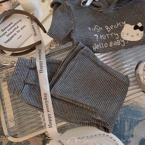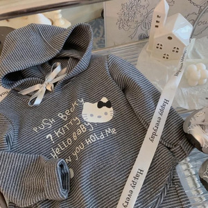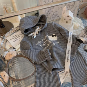 女童秋季套装女宝宝小猫连帽卫衣洋气条纹喇叭裤两件套潮0090A018