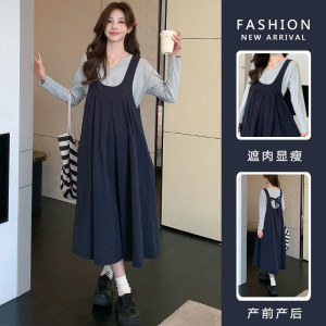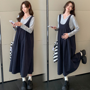 孕妇装早秋新款休闲气质宽松百搭蓝色背心裙+灰色打底衫孕妇套装