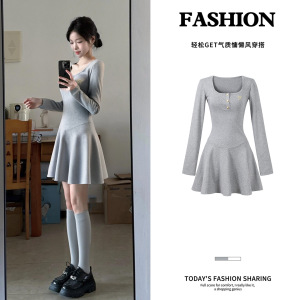 灰色长袖收腰连衣裙短款女早秋冬季大衣内搭冷淡韩系小个子a字裙