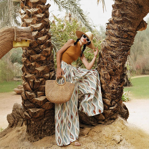 跨境舒适休闲复古民族风度假菱形流苏印花撞色宽松阔腿裤高腰长裤