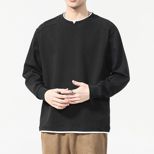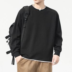 纯色假两件长袖T恤男春秋季2025款宽松百搭叠穿圆领棉卫衣打底衫