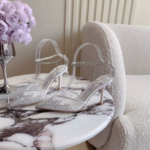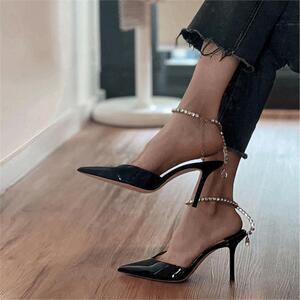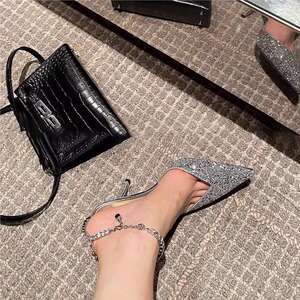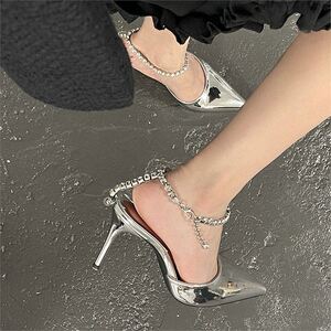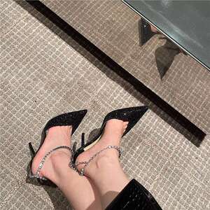 浅口尖头纯色凉鞋女2025春夏吊坠扣带细跟高跟鞋水钻链条婚鞋