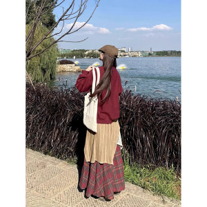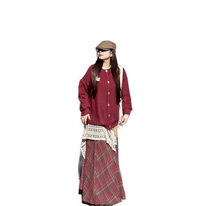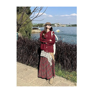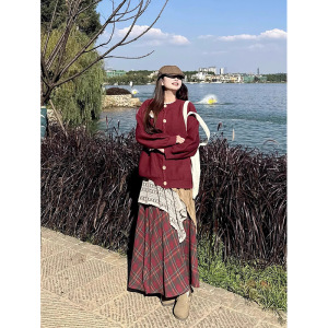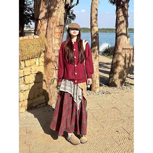 2025秋季花边设计感元气宽松格纹开衫毛衣外套+拼接半身裙两件套