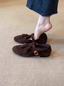 现货复古法式浅口一字带流苏玛丽珍鞋圆头皮带扣平跟单鞋小皮鞋