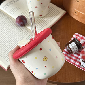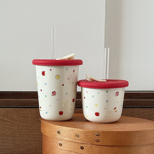 新款2025可爱苹果陶瓷吸管杯带盖密封高颜值咖啡杯家用喝水杯女生
