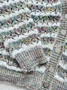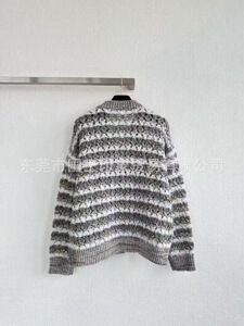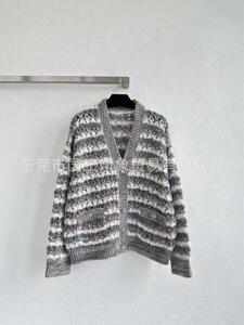 国王印象 秋冬新款小香风撞色条纹V领勾花镂空长袖针织开衫外套女