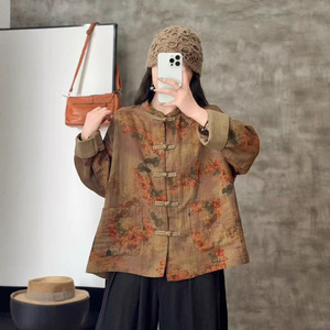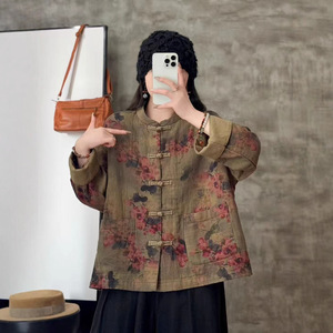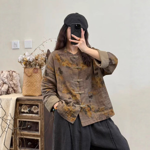 复古文艺斜纹棉双层纱印花长袖外套2025年秋款宽松立领盘扣女上衣