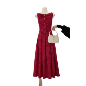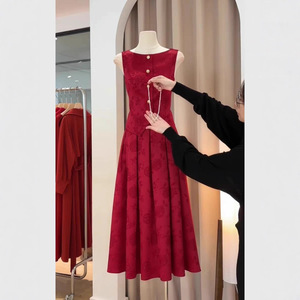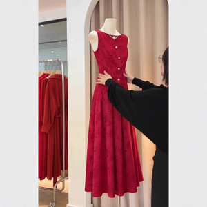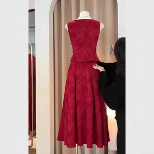 新中式国风红色印花无袖上衣阔太太夏装两件套订婚礼服连衣裙套装