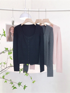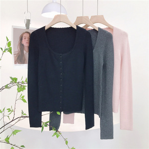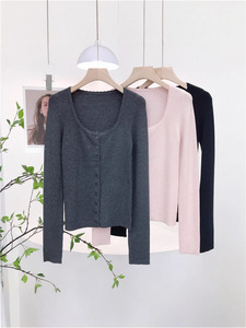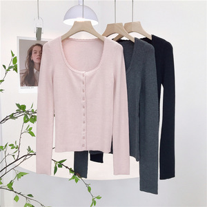 秋季新款韩版温柔风花边方领长袖单排扣修身显瘦针织开衫打底上衣