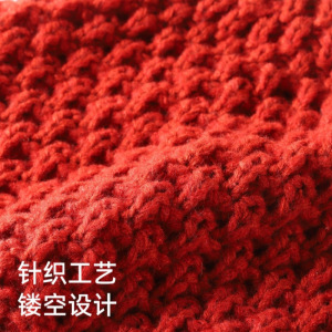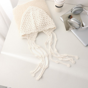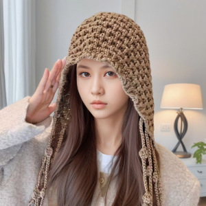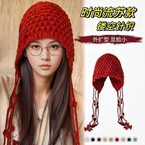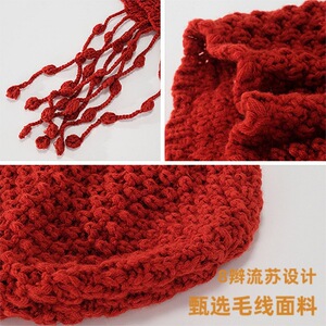 川西旅游红色流苏针织帽冬季韩版显脸小套头帽手工镂空毛线帽子女