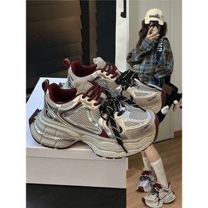 安可拉红网面老爹鞋女圆头厚底2025春秋新款时尚休闲运动鞋潮