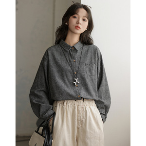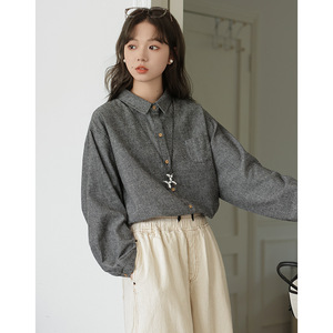 冷淡风复古黑色条纹衬衫女长袖磨毛宽松POLO领内穿百搭上衣衬衣