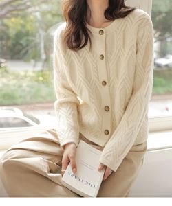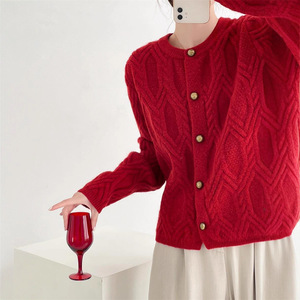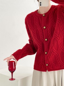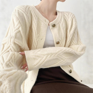 复古麻花针织衫秋冬新款韩系慵懒风几何绞花设计宽松圆领毛衣开衫