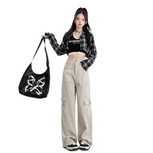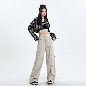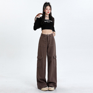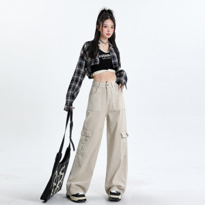 秋季新款工装牛仔裤女美式高街辣妹设计感口袋宽松显瘦拖地阔腿裤