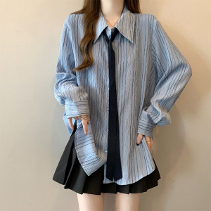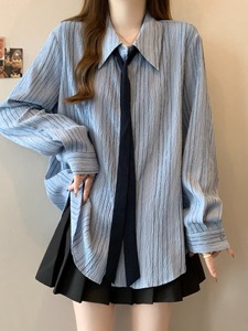 蓝色条纹【港味chic上衣/别致漂亮/减龄穿搭/设计感小众/内搭打底衫/法式复古长袖/宽松/炸街轻奢
