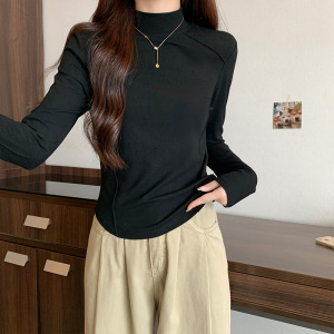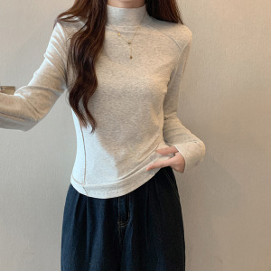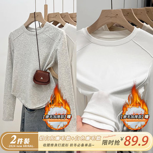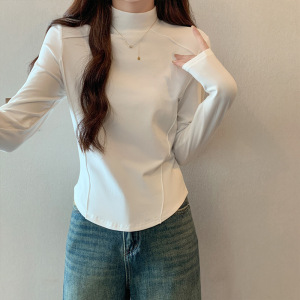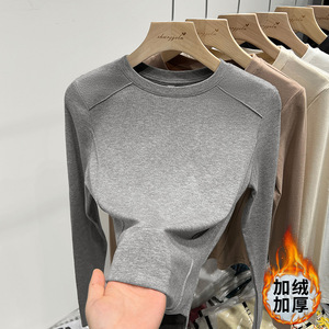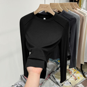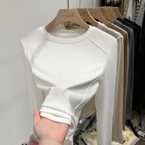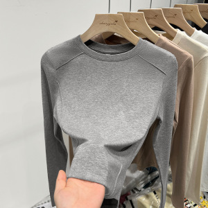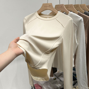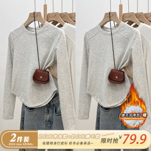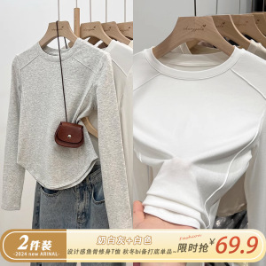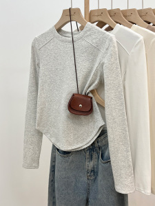 奶白灰弧形下摆早秋长袖不规则外穿打底衫t恤女纯欲修身圆领内搭