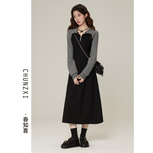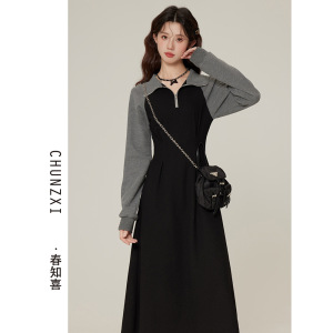 60221#春知喜秋季新款Polo领休闲连衣裙女显瘦气质收腰长袖卫衣裙