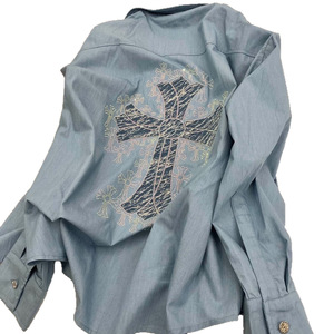 2025早秋季女装新款时尚洋气薄款牛仔十字架烫钻宽松长袖衬衫上衣