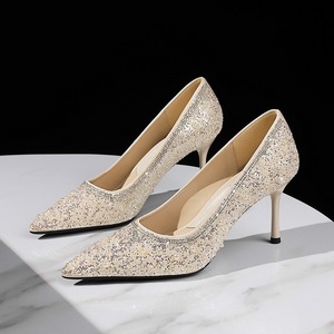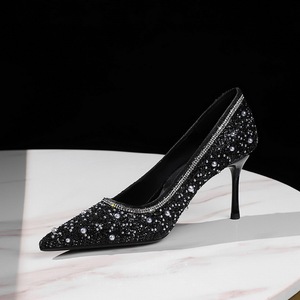 7376-A欧美风宴会尖头气质细跟浅口单鞋女一脚蹬珍珠水钻高跟女鞋