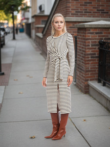 2025年欧美时尚气质新款条纹腰部扭结收腰修身显瘦开叉圆领连衣裙