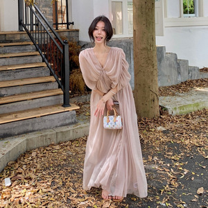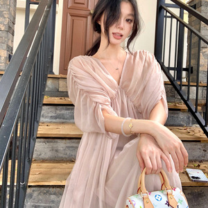 适美2025夏季设计感网纱拼接气质气质短袖连衣裙女小众别致A字裙