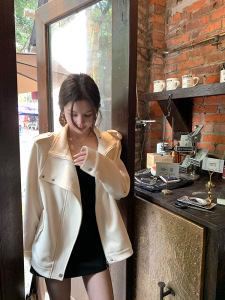 titi小姐姐【白巧恋人】麂皮外套女秋米白色设计感机车风宽松夹克