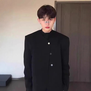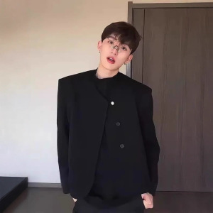 男模穿搭小香风无领外套黑色短款高级感痞帅中式西装春秋正肩夹克