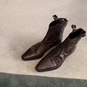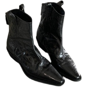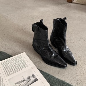 羊皮版~尖头V口西部靴女切尔西法式复古褶皱瘦瘦靴粗跟真皮短靴子