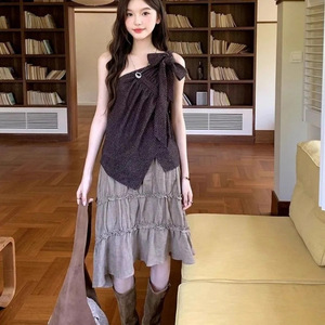 法式度假风女夏季新款蝴蝶结斜肩吊带背心上衣蛋糕半身裙子套装潮