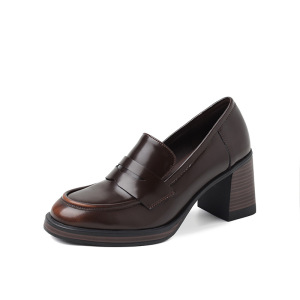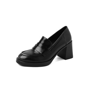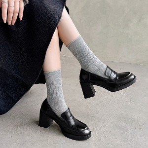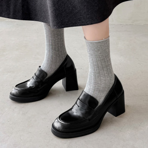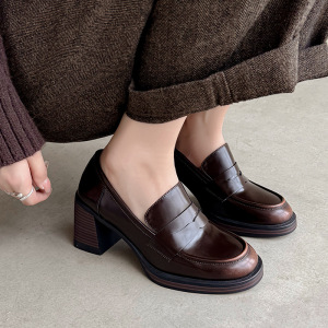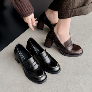 配小西装牛皮高跟乐福鞋2025秋季通勤粗跟宽松圆头真皮深口单鞋女