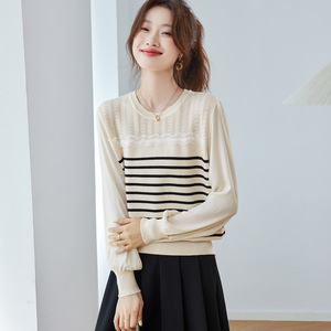 条纹针织长袖纱袖女秋季2025新款设计感假两件减龄圆领体恤上衣