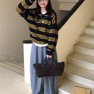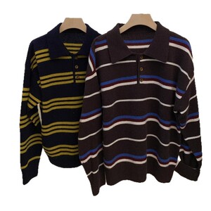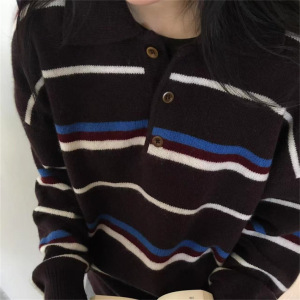2025秋冬新款复古休闲polo领条纹针织衫上衣女学院风韩版宽松毛衣