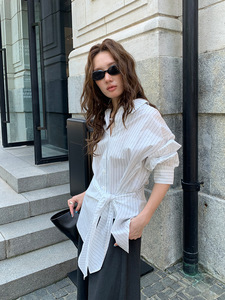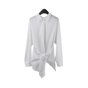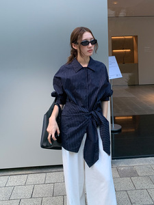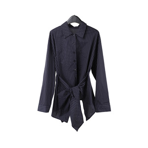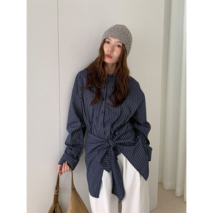 THE MIND绑带条纹长袖衬衫女2025十三行秋新款韩系纯棉衬衣T5507Q
