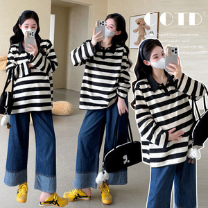 孕妇装套头POLO领条纹卫衣春秋2025新款时尚t恤长袖宽松休闲上衣