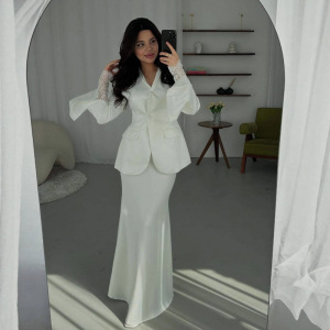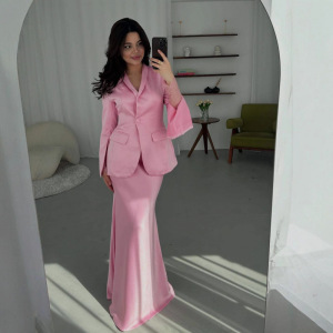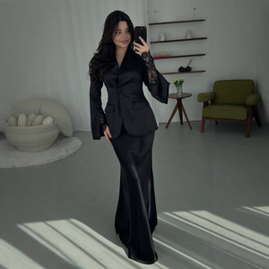 2025秋冬欧美中东休闲设计感修身时尚气质纯色西装外套缎面长裙套