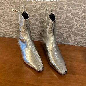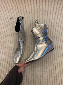 百搭尖头短靴女2025时尚韩版新款瘦瘦靴内增高春季后拉链银色短筒