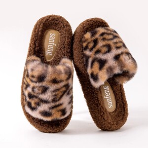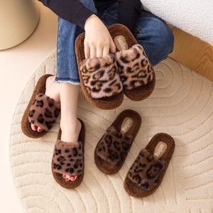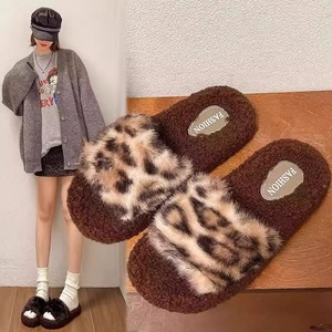 2025秋冬季网红豹纹时尚百搭毛毛拖鞋女外穿一字拖潮鞋厚底棉拖鞋