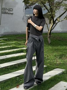 高级感灰色西裤女夏季微喇高腰排扣设计休闲裤宽松显瘦条纹拖地裤