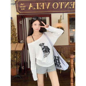美式甜辣妹斜领露肩长袖T恤2025早秋卡通印花设计感宽松慵懒上衣
