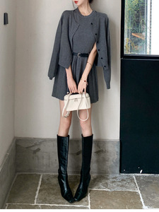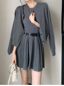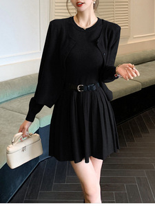 秋冬季针织开衫套装女软糯百搭圆领毛衣外套百褶吊带背心裙两件套