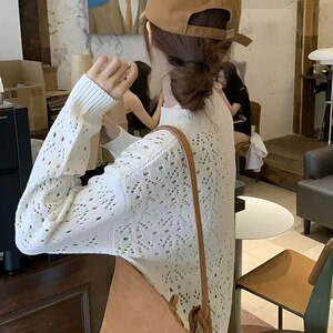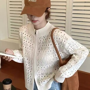 韩系双拉链镂空钩花长袖针织开衫女2025新款秋季宽松短款外套上衣