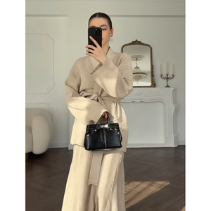 欧美跨境外贸2025春季宽松绑带口袋V领开衫外套舒适半身裙套装女
