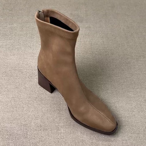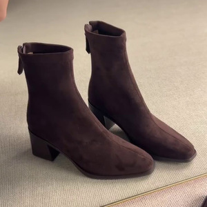 现货版~简约绒面瘦瘦靴法式复古粗跟方头弹力靴百搭女款显瘦时尚
